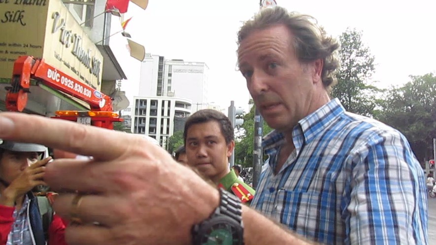 Chủ xe ô tô đậu sai quy định là một người nước ngoài nói tiếng Việt khá rành. 'Ông Tây' bất ngờ chạy tới bóc niêm phong, cãi lý rằng: tại sao không thông báo để tôi hợp tác mà dán niêm phong, cẩu xe? Biển cấm được dựng ở chỗ nào?