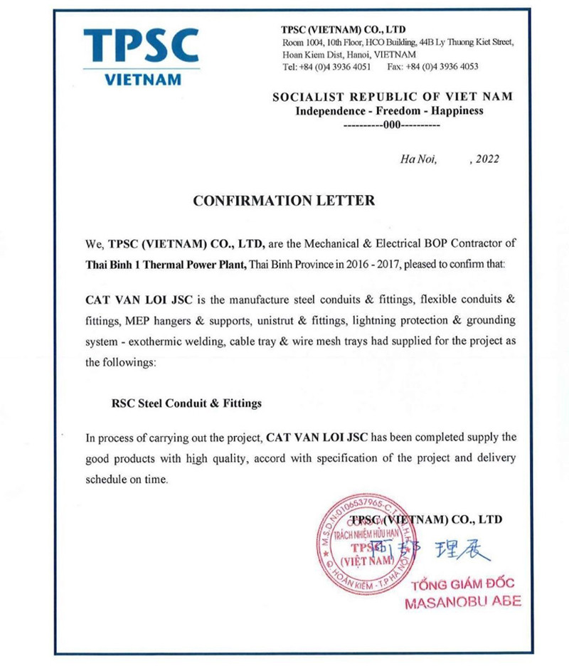 Trong năm 2021 – 2022 Cát Vạn Lợi đã trở thành nhà cung cấp các loại ống thép luồn dây điện và phụ kiện cho dự án nhà máy Nhiệt điện Thái Bình 1, tham gia vào chuỗi cung ứng toàn cầu của tập đoàn Toshiba Plant Systems & Services Corporation (TPSC Việt Nam).