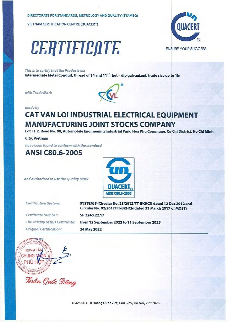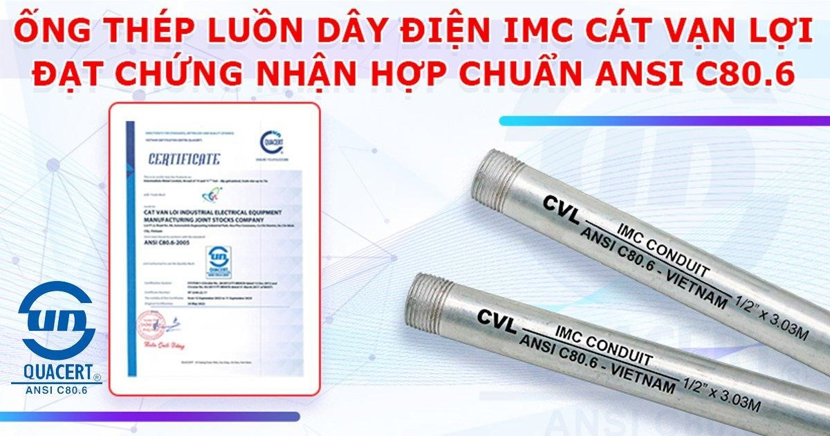 Ống luồn dây điện IMC do Cát Vạn Lợi cung cấp được Trung tâm chứng nhận Phù hợp (Quacert) thuộc Tổng cục Tiêu chuẩn Đo lường Chất lượng giám sát từ vật tư thép đầu vào chứng nhận đạt Tiêu chuẩn Viện Tiêu chuẩn quốc gia Hoa Kỳ ANSI C80.6. Được biết, ANSI là bộ tiêu chuẩn Hoa Kỳ do tổ chức ANSI (American National Standards Institute: Viện tiêu chuẩn quốc gia Hoa Kỳ), nhằm thúc đẩy công tác phát triển tiêu chuẩn quốc gia của Mỹ thông qua việc công nhận các quy trình của các tổ chức tiêu chuẩn.