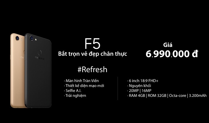 OPPO vừa ra mắt sản phẩm F5, smartphone có thiết kế tràn màn hình tràn viền FHD+ (Full HD Plus 2160x1080 với tỉ lệ 18:9) và công nghệ selfie làm đẹp với trí tuệ nhân tạo (Camera A.I).