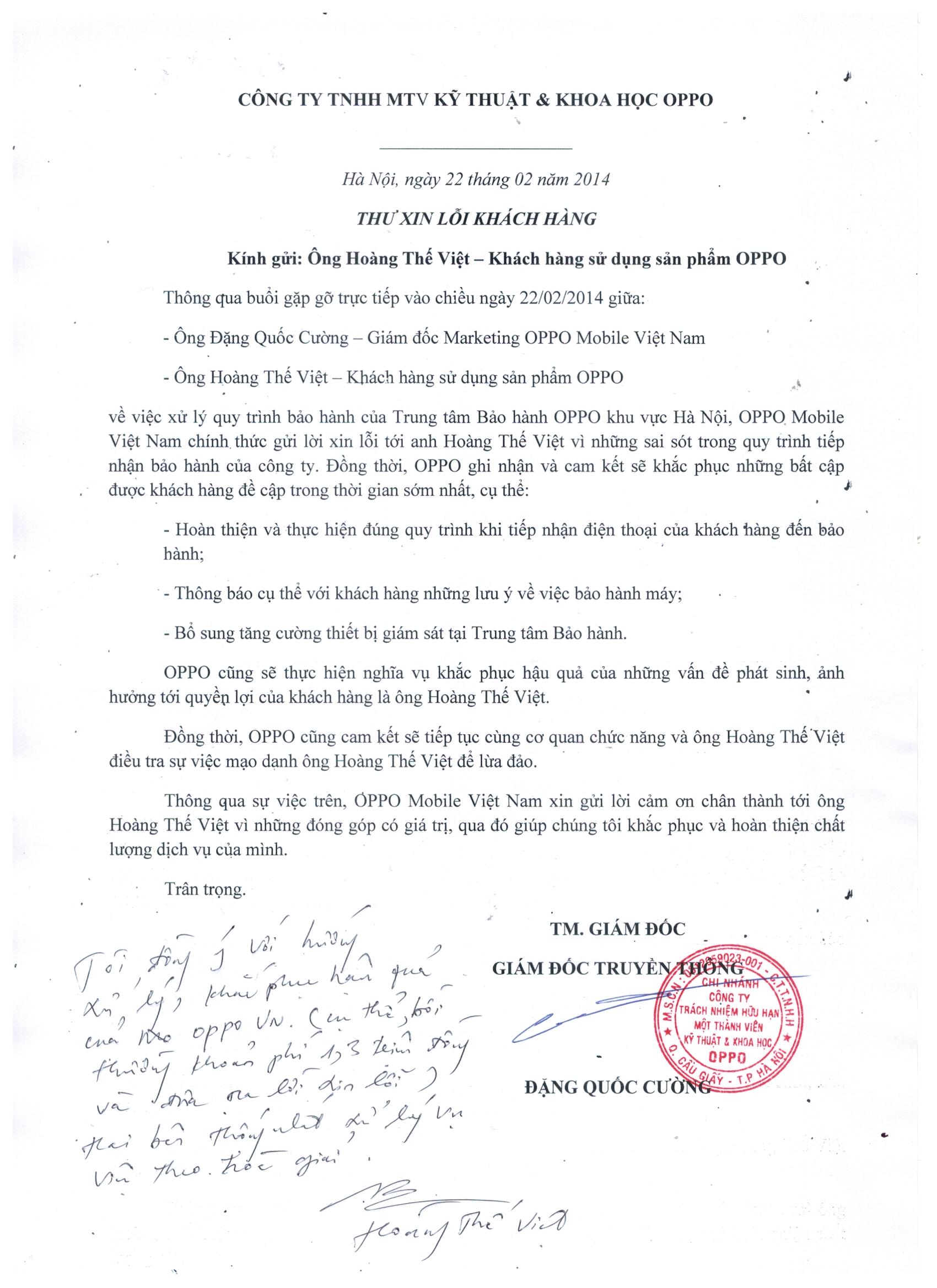 Cụ thể, ông Đặng Quốc Cường, Giám đốc OPPO Việt Nam đã tiến hành gửi thư xin lỗi khách hàng Hoàng Thế Việt và cam kết sẽ khắc phục những vấn đề bất cập mà khách hàng nêu ra như: Hoàn thiện và thực hiện đúng quy trình khi tiếp nhận điện thoại của khách hàng đến bảo hành; Thông báo cụ thể với khách hàng những lưu ý về việc bảo hành máy; Bổ sung tăng cường thiết bị giám sát tại trung tâm bảo hành.