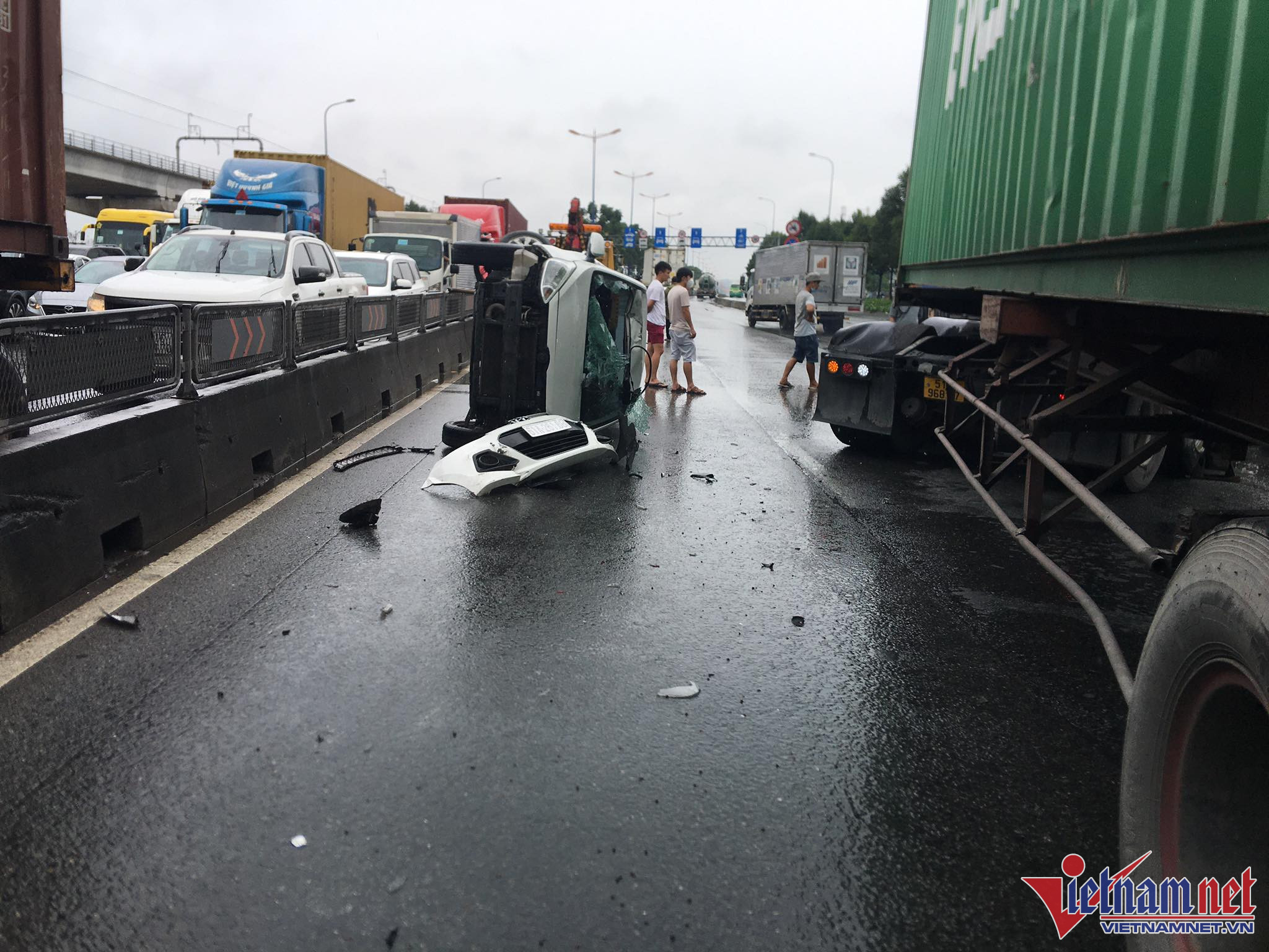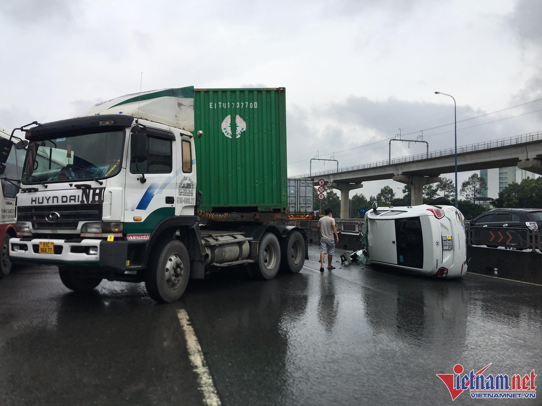 Khi phương tiện vừa đổ xuống hết dốc cầu vượt ngã 4 Thủ Đức thì bất ngờ tông vào dải phân cách giữa đường rồi trượt dài về phía trước, lật nhào ra giữa đường.