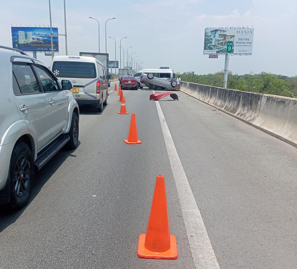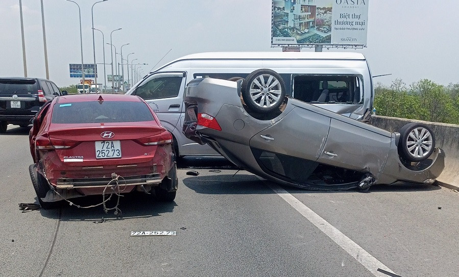 Khi đến địa điểm trên thì xảy ra tai nạn liên hoàn, trong đó, ô tô 5 chỗ BKS 72L-1925 lật ngửa nằm trên làn khẩn cấp.
