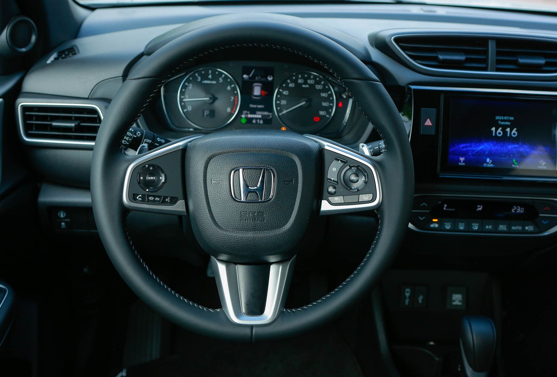 Vô lăng Honda BR-V 2023 cũng có cùng thiết kế thể thao tương tự CR-V thế hệ 5. Vô lăng được bọc da cao cấp, tích hợp đầy đủ điều khiển âm thanh, đàm thoại rảnh tay, điều khiển hành trình cruise control. Riêng phiên bản BR-V L có thêm lẫy chuyển số thể thao.