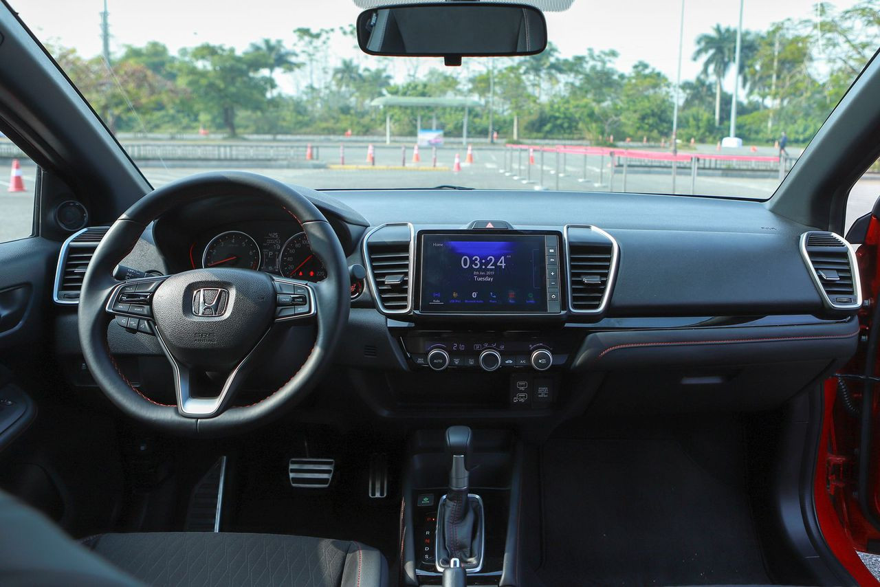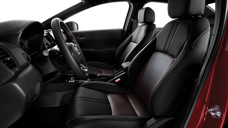 Việc tăng thêm chiều dài và chiều rộng giúp Honda City 2023 có được không gian rộng rãi hơn trước. City tiếp tục là mẫu xe rộng nhất phân khúc hạng B hiện nay. City 2023 có 2 tùy chọn chất liệu bọc ghế. Phiên bản City G và L sử dụng bọc ghế nỉ. Bản cao cấp RS sử dụng bọc ghế da kết hợp da lộn và nỉ, chạy thêm viền chỉ đỏ theo phong cách thể thao đặc trưng của phiên bản này.