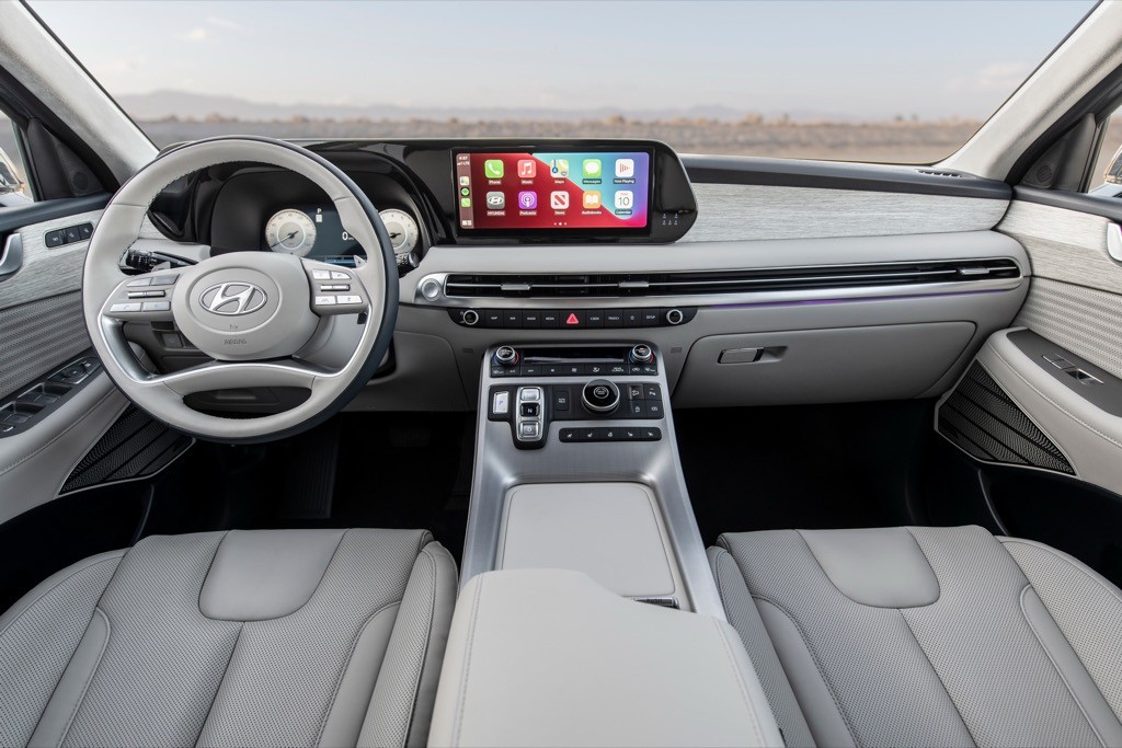 Thiết kế không gian nội thất Hyundai Palisade 2023 hướng theo phong cách tinh tế, sang trọng và cao cấp với chất liệu da Nappa kết hợp vật liệu thân thiện môi trường và nhôm định hình. Ghế lái chỉnh điện 12 hướng (có sưởi/làm mát, nhớ vị trí), ghế phụ chỉnh điện 8 hướng (có sưởi/làm mát), hàng ghế thứ hai có sưởi/làm mát (chỉ có trên bản 7 chỗ)