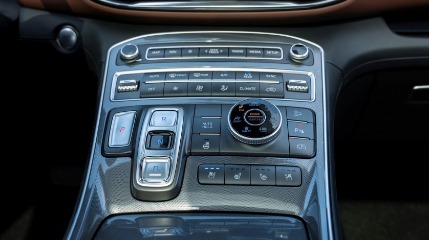 Khu vực lái Hyundai SantaFe 2023 ấn tượng với bệ điều khiển trung tâm được tái thiết kế hoàn toàn mới. Bệ điều khiển được nâng cao, gần hơn với người lái. Tất cả nút chức năng như chỉnh điều hoà xe, chế độ lái, chế độ địa hình, sưởi/làm mát ghế… đều được bố trí trên đây. Một điểm mới khác là xe đã đổi sang chuyển số bằng nút bấm thay vì dùng cần số truyền thống. Thay vào đó là nút bấm điện để lựa chọn số P, R, N và D như các mẫu xe sang hiện đại, tạo ra sự sang trọng và đẳng cấp. Bên cạnh đó, trang bị bệ tỳ tay ở khu vực này khá lớn, giúp tài xế thoải mái kê tay mà không lo bị mỏi. Các hộc chứa đồ, khay đựng cốc tích hợp cạnh bệ tỳ tay, trên tapi cửa và rải rác khắp cabin giúp người sử dụng dễ dàng đựng các vật dụng cá nhân.