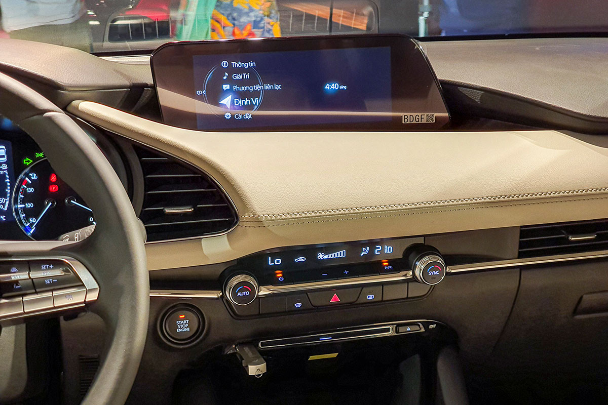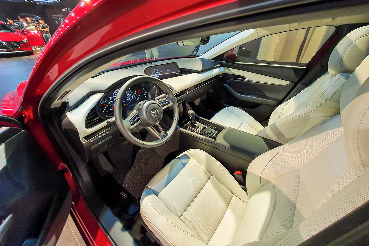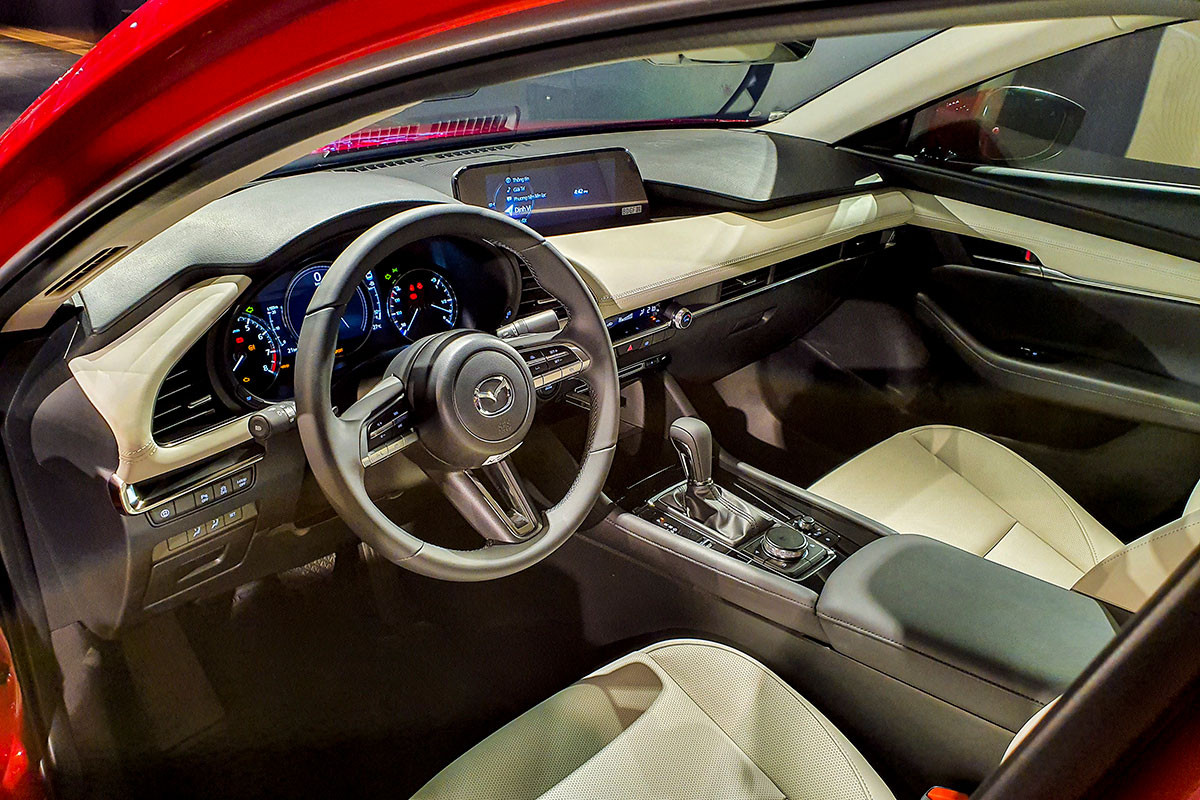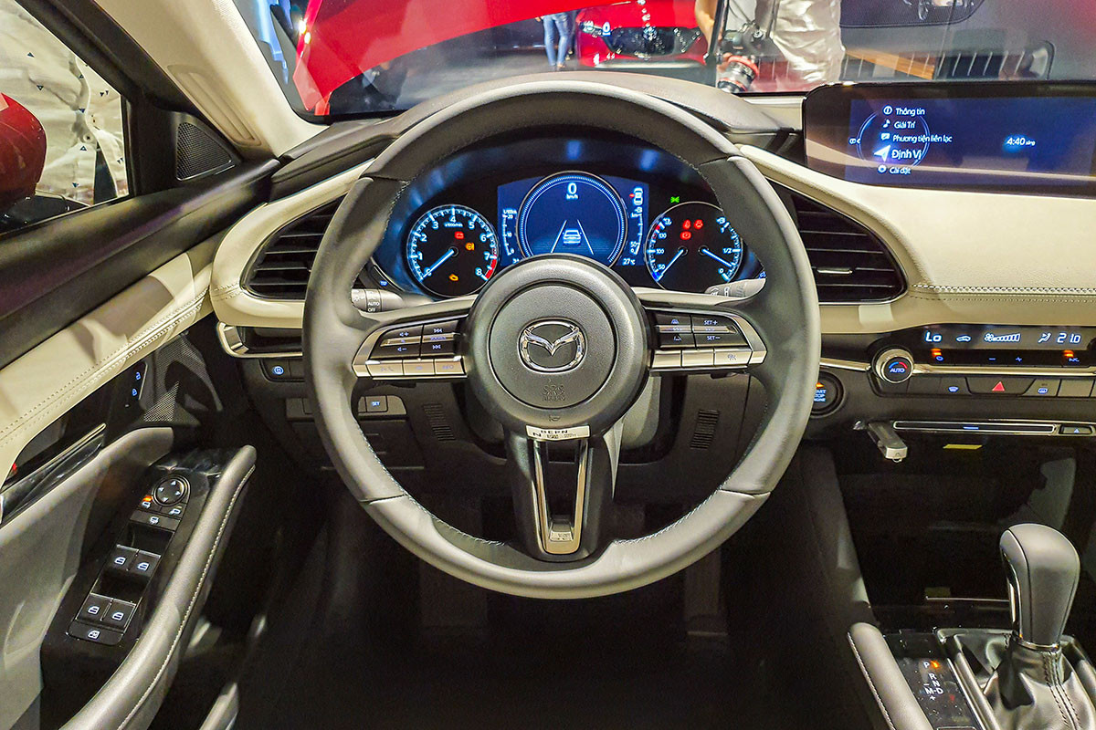 Vô lăng 3 chấu mới tích hợp nút bấm với các đường viền crom mảnh và màn hình giải trí trung tâm 8,8 inch là những điểm nhấn trên Mazda3 2021. Phía sau đó là màn hình hiển thị thông tin HUD. Ghế ngồi sử dụng chất liệu da và có thêm tuỳ chọn ghế nỉ ở phiên bản Deluxe.