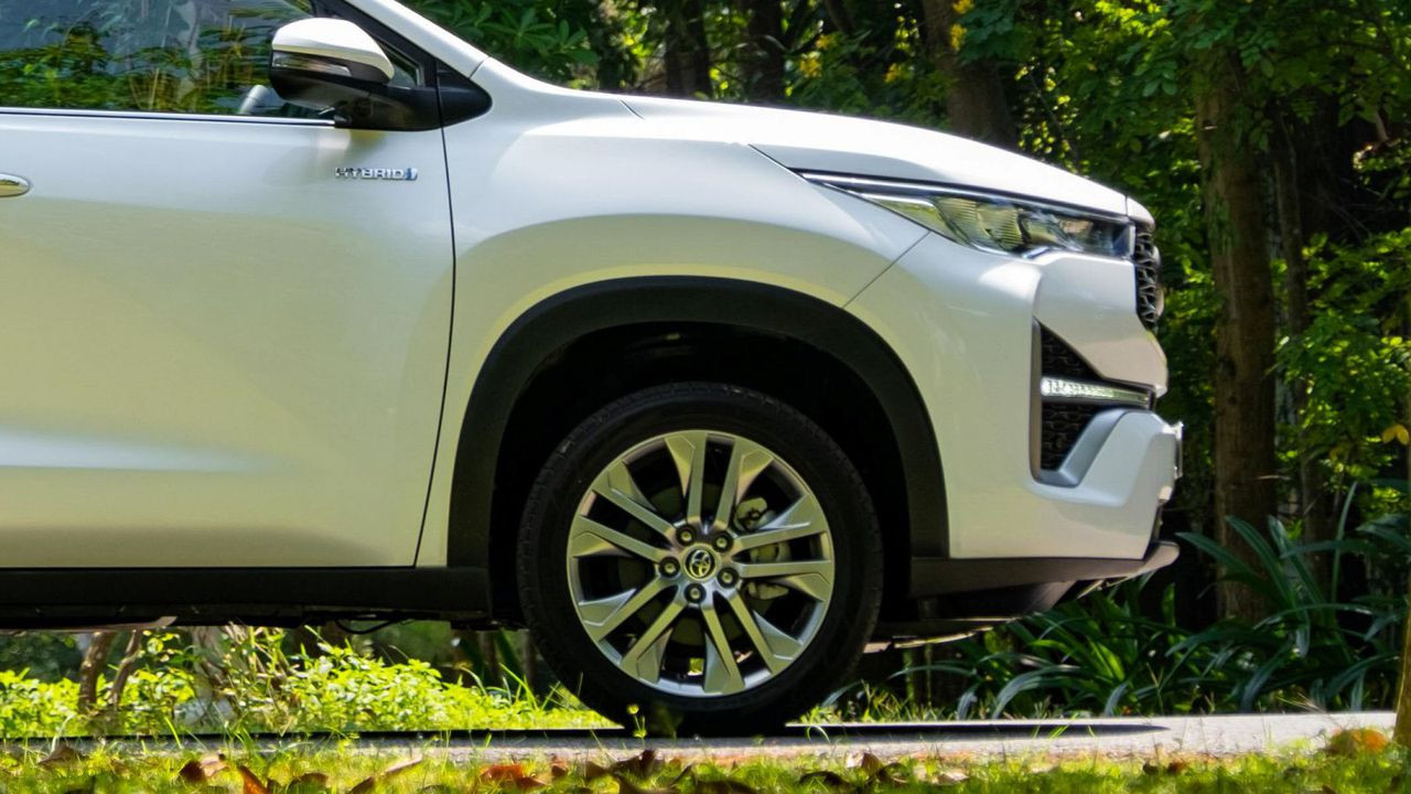 Phía trước, Innova Cross nổi bật với cụm lưới tản nhiệt hình lục giác, viền dưới mạ crom. Nối liền với đó là hệ thống đèn trước full-LED, từ đèn pha, đèn định vị ban ngày kiêm đèn xi-nhan nay được đặt thấp xuống dưới, ngay phía trên khe gió giả, sương mù cho đến đến đèn hậu.. Vành thiết kế mới, bản HEV lắp vành 18 inch, trong khi bản Xăng dùng vành 17 inch. Thân xe được tạo hình cơ bắp với nhiều đường gân dập nổi.