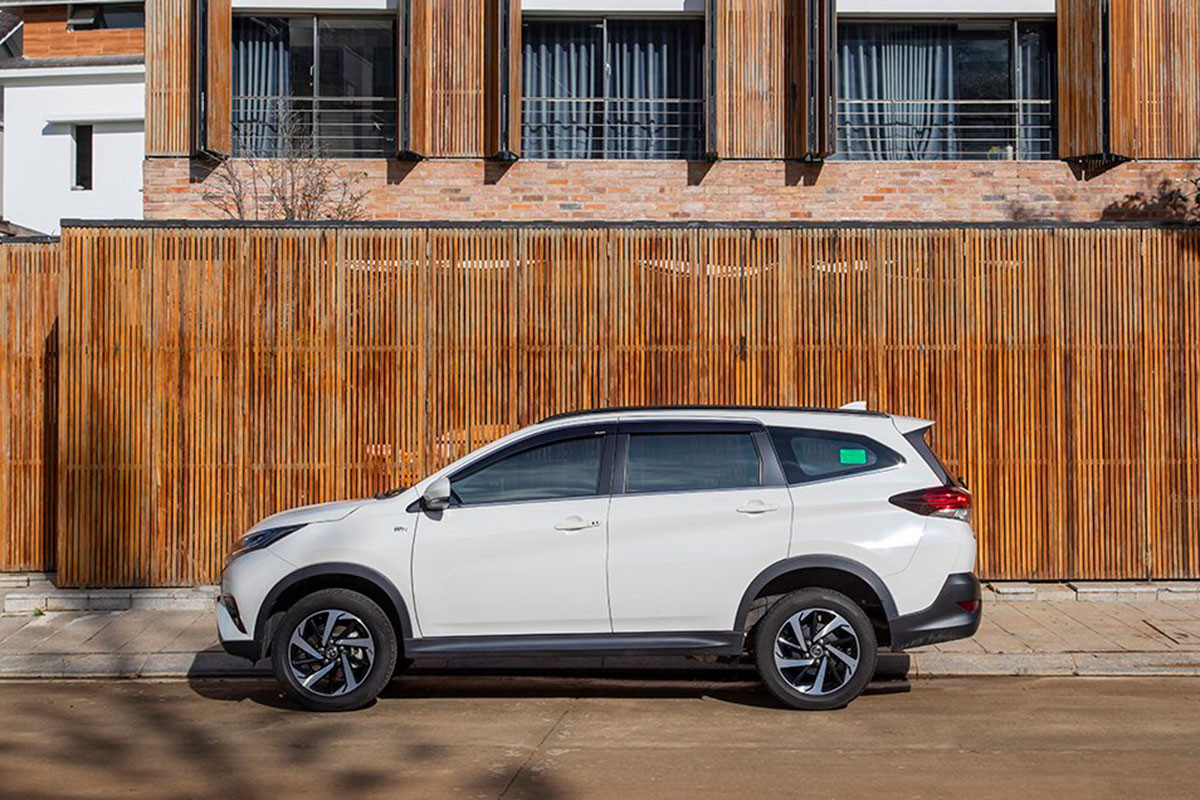 Kích thước chiều dài, chiều rộng và chiều cao của Rush mới lần lượt là 4.435, 1.695 và 1.705 mm, chiều dài cơ sở đạt 2.685 mm và khoảng sáng khung gầm lớn 220 mm. Thân xe nổi bật với bộ la-zăng 17 inch, gương chiếu hậu tích hợp tính năng gập/chỉnh điện và báo rẽ.