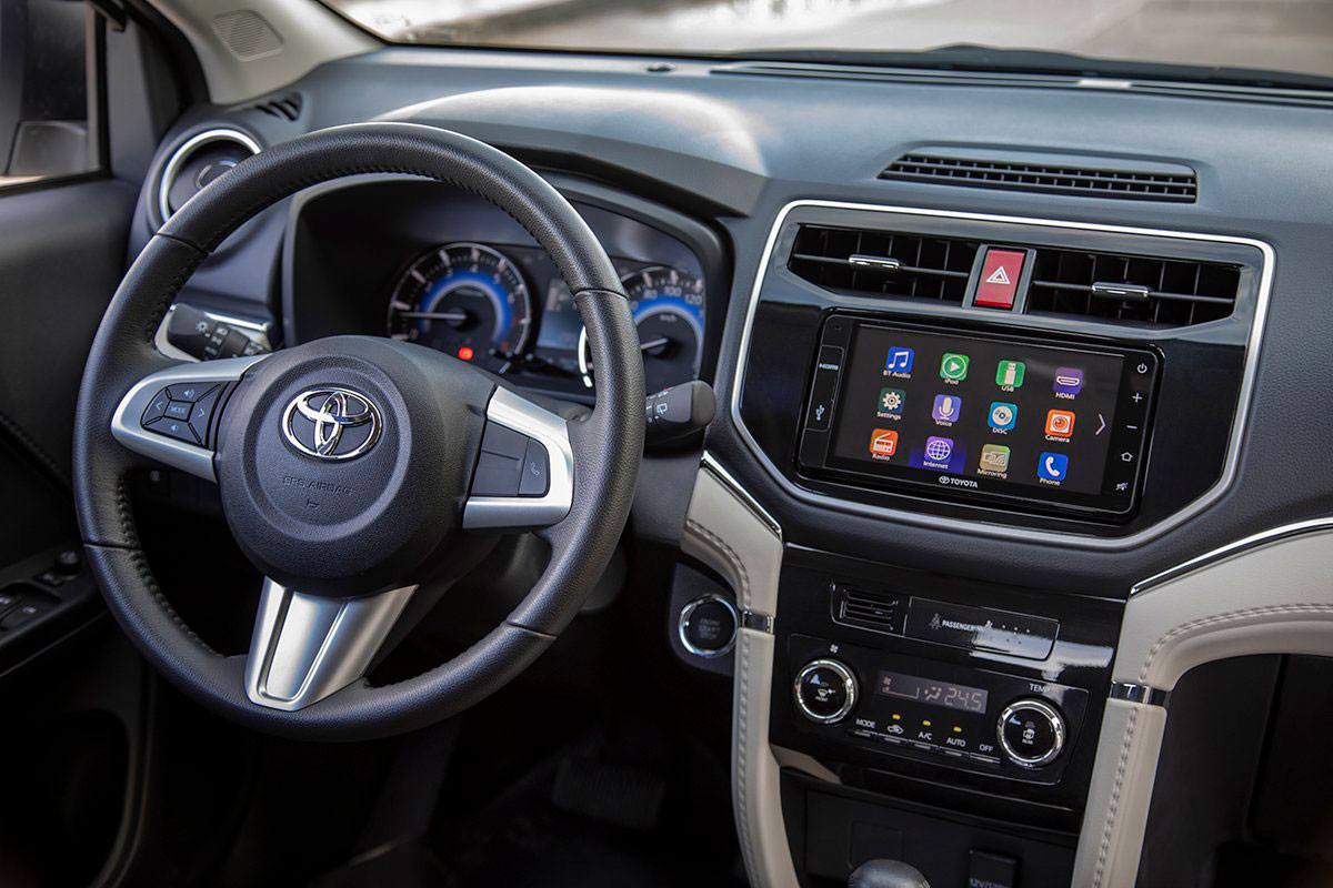 Trên Toyota Rush 2021, người dùng sẽ được sở hữu các trang bị như màn hình cảm ứng 7 inch kết nối điện thoại thông minh; đầu đĩa DVD 7 inch, hệ thống âm thanh 8 loa, cổng kết nối AUX, kết nối USB, kết nối Bluetooth, điều khiển bằng giọng nói, điều khiển từ hàng ghế sau, kết nối wifi, hệ thống đàm thoại rảnh tay, kết nối nối điện thoại thông minh, kết nối HDMI, chìa khóa thông minh, khởi động bằng nút bấm…