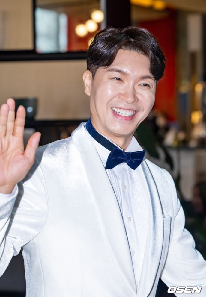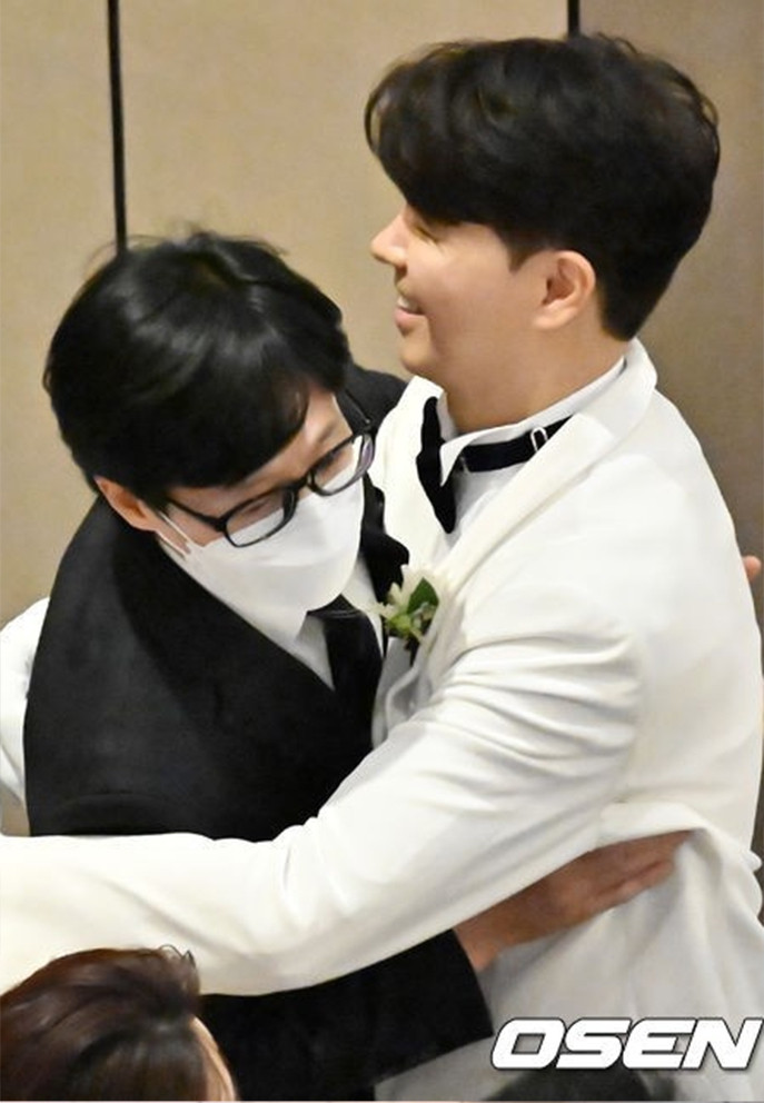 Nam diễn viên diện vest trắng trong ngày cưới. Anh đón tiếp Yoo Jae Suk dự lễ cưới.