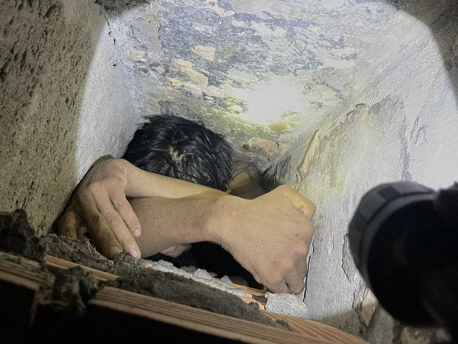 Sợ bị bắt, Luân chạy vào một cơ sở massage gần đó để lẩn trốn, sau đó trèo lên mái nhà rồi chui vào ống thoát hơi để xuống đất. Tuy nhiên, do ống thoát hơi hẹp nên thanh niên này bị mắc kẹt bên trong.