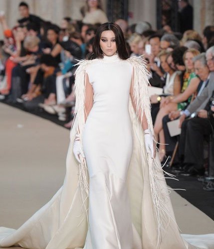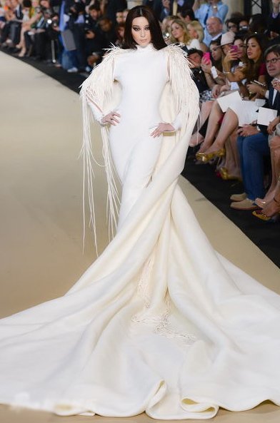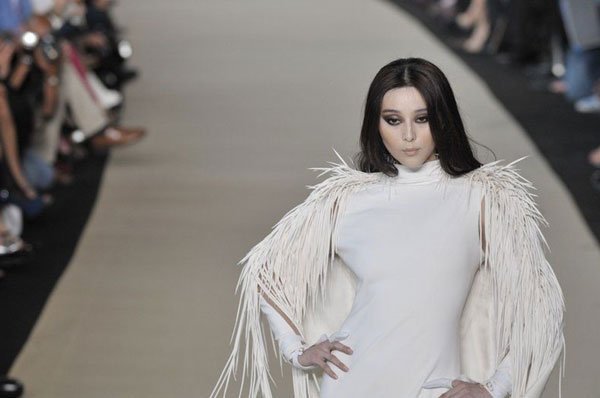 Tuy không phải là người mẫu chuyên nghiệp và cũng không còn trẻ nhưng Phạm Băng Băng vẫn tỏ ra rất tự tin khi bước trên sàn catwalk. Cô gây ấn tượng với người xem với mái tóc đen thẳng, gương mặt lạnh cùng chiếc váy trắng đuôi dài sang trọng.