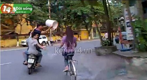 Clip 3 gã thanh niên đi xe máy và hắt xô nước vào những bạn gái đi trên đường đang gây nên một làn sóng phản đối lớn.