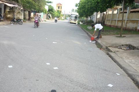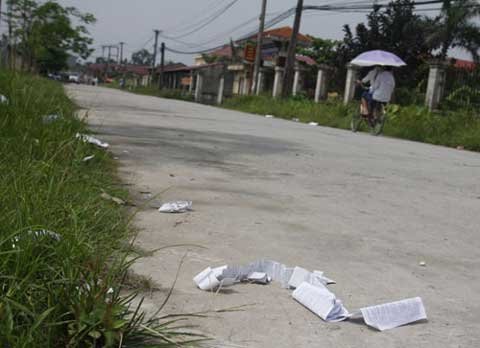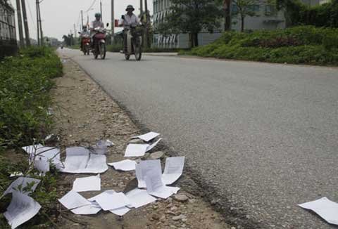 | Sau môn thi lịch sử, phao thi rải trắng trên nhiều con đường gần cổng trường THPT Phan Đình Phùng. Ảnh Trần Văn |