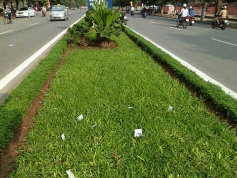 | "Phao thi" vứt trên thảm cỏ dải phân cách gần Trường THPT Cầu Giấy (Q.Cầu Giấy, Hà Nội). Ảnh: Thanh Niên |