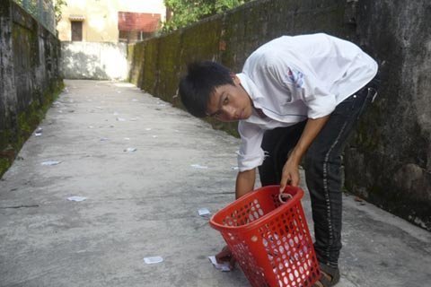 Học sinh này đang đi thu gom phao thi. Ảnh Trần Văn |