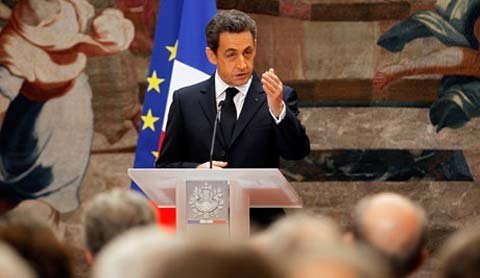 Tổng thống Nicolas Sarkozy phát biểu tại Điện Elysée ở Paris vài giờ trước khi Pháp bị hạ tín nhiệm tín dụng khỏi mức AAA. (Ảnh: AP)