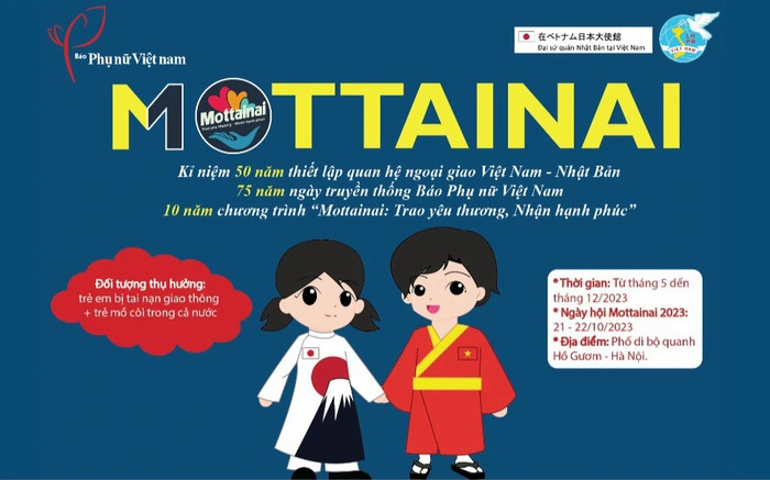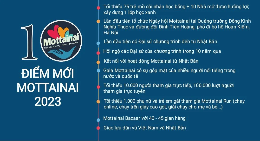 Chương trình Mottainai 2023 sẽ có nhiều điểm mới, dự kiến được thực hiện từ tháng 5 đến tháng 12/2023; Gala Mottainai diễn ra vào ngày 21 & 22/10/2023 tại Quảng trường Đông Kinh Nghĩa Thục và đường đôi Đinh Tiên Hoàng, phố đi bộ hồ Hoàn Kiếm, Hà Nội.