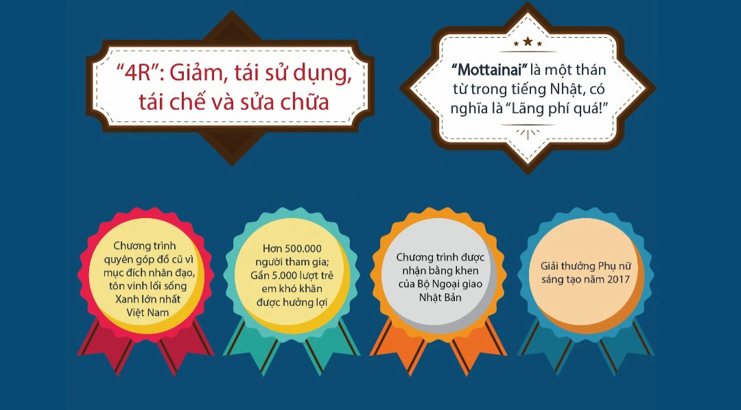 Sau 9 mùa tổ chức, Chương trình Mottainai của Báo Phụ nữ Việt Nam đã trở thành chương trình quyên góp đồ cũ vì mục đích nhân đạo, tôn vinh lối sống Xanh lớn nhất Việt Nam; Thu hút hơn 500.000 người tham gia, gần 5.000 lượt trẻ em khó khăn được hưởng lợi. Chương trình đã được nhận Bằng khen của Đại sứ quán Nhật Bản, được trao Giải thưởng Phụ nữ sáng tạo năm 2017. Ghi nhận về Chương trình, bà Nguyễn Thị Minh Hương, Phó Chủ tịch Hội Liên hiệp Phụ nữ Việt Nam, khẳng định: "Chương trình Mottainai đã làm lan tỏa cảm hứng bảo vệ môi trường, chia sẻ yêu thương trong cộng đồng. Hy vọng Chương trình Mottainai tiếp tục góp thêm tiếng nói của tình đoàn kết, nhân ái và ý chí quyết tâm hướng tới một tương lai an toàn hơn, tốt đẹp hơn!". |