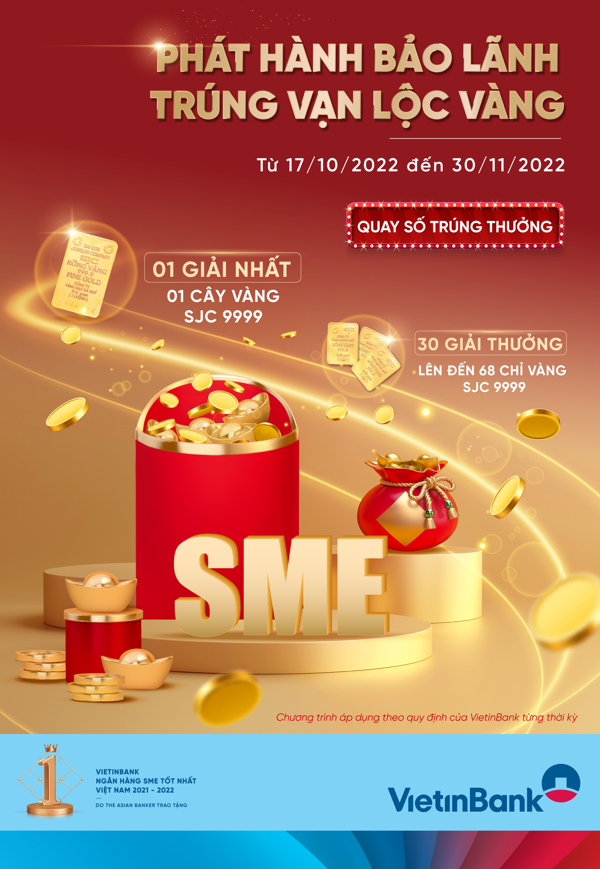 Theo đó, doanh nghiệp được VietinBank phát hành cam kết bảo lãnh mới với mức phí từ 10 triệu đồng trở lên và sử dụng dịch vụ ngân hàng số VietinBank eFAST sẽ có cơ hội tham gia quay số trúng thưởng cuối chương trình. VietinBank dành tặng 30 giải thưởng cho các doanh nghiệp may mắn trúng thưởng, trong đó giải Nhất là 1 lượng vàng SJC.