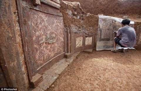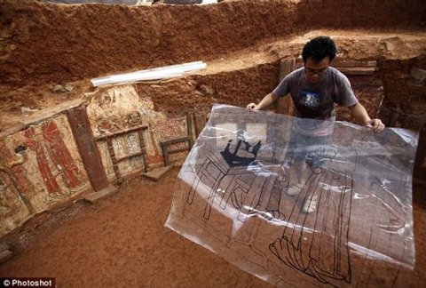 Các nhà khảo cổ Trung Quốc đang vẽ lại những bức họa bích để nghiên cứu.