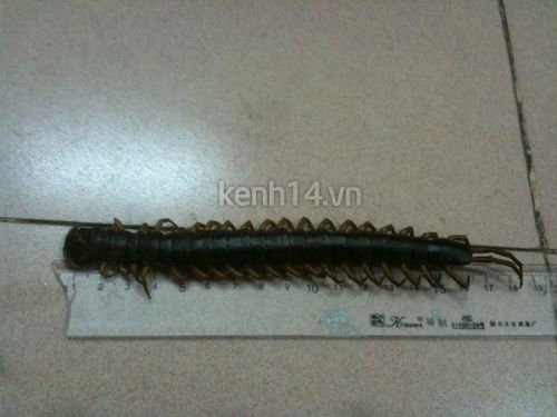 Đang ngồi xem ti vi, bất ngờ chị Phan Thị Cẩm Vân sống ở Long Biên, Hà Nội phát hiện một sinh vật màu đen đen ở dưới gầm tủ đang bò lổm ngổm. Sau khi "tóm" được, cả nhà chị Vân phát hoảng vì đó là con rết có kích thước... khổng lồ!