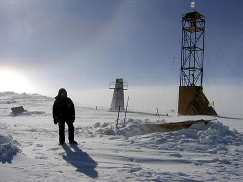 Một người đàn ông đứng gần thiết bị khoan thăm dò tại Trạm nghiên cứu hồ Vostok của Nga ở Nam cực năm 2006. Ảnh: Reuters.