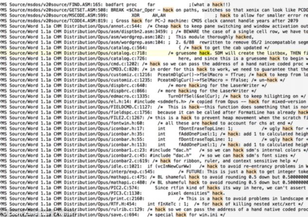 Mã nguồn MS-DOS cho thấy từ "hack" được lặp lại rất nhiều lần