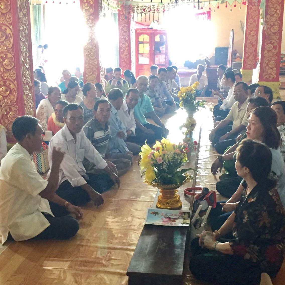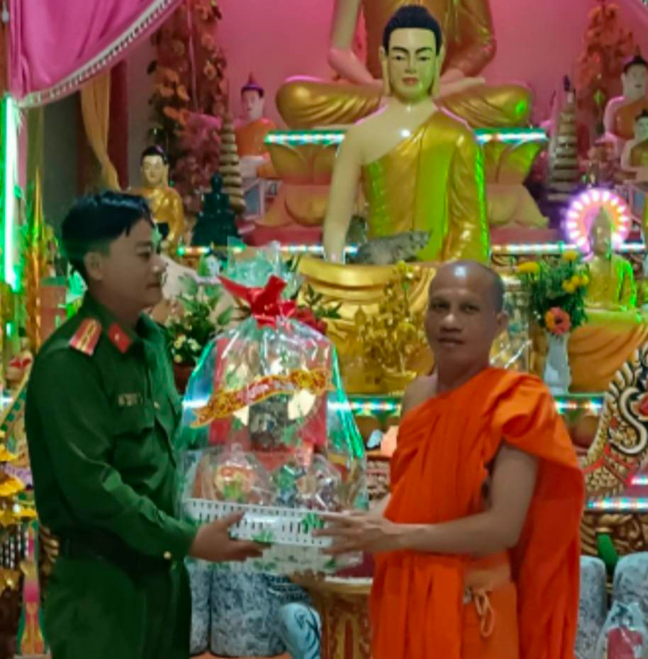Thiếu tá Thạch Quốc Thi thăm, tặng quà Đại đức Lâm Hữu Tài, trụ trì chùa Phnô Ta Niêu ở ấp Nam Chánh, xã Lịch Hội Thượng, đồng thời dự họp mô hình "Sư sãi và phật tử phòng chống tội phạm".