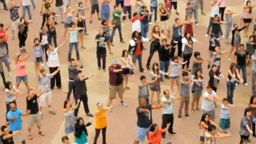 Hàng trăm người cùng trình diễn điệu nhảy flashmob trên nền nhạc "I can't take my eyes off you" sôi động.