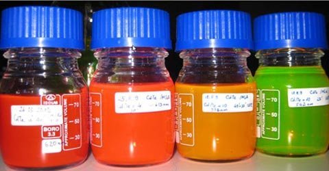 | Các lọ chứa chấm lượng tử bán dẫn được chế tạo thành công ở Viện khoa học vật liệu. Huỳnh quang rực rỡ ngay dưới ánh sáng trong phòng cho thấy chất lượng vật liệu rất cao. |
