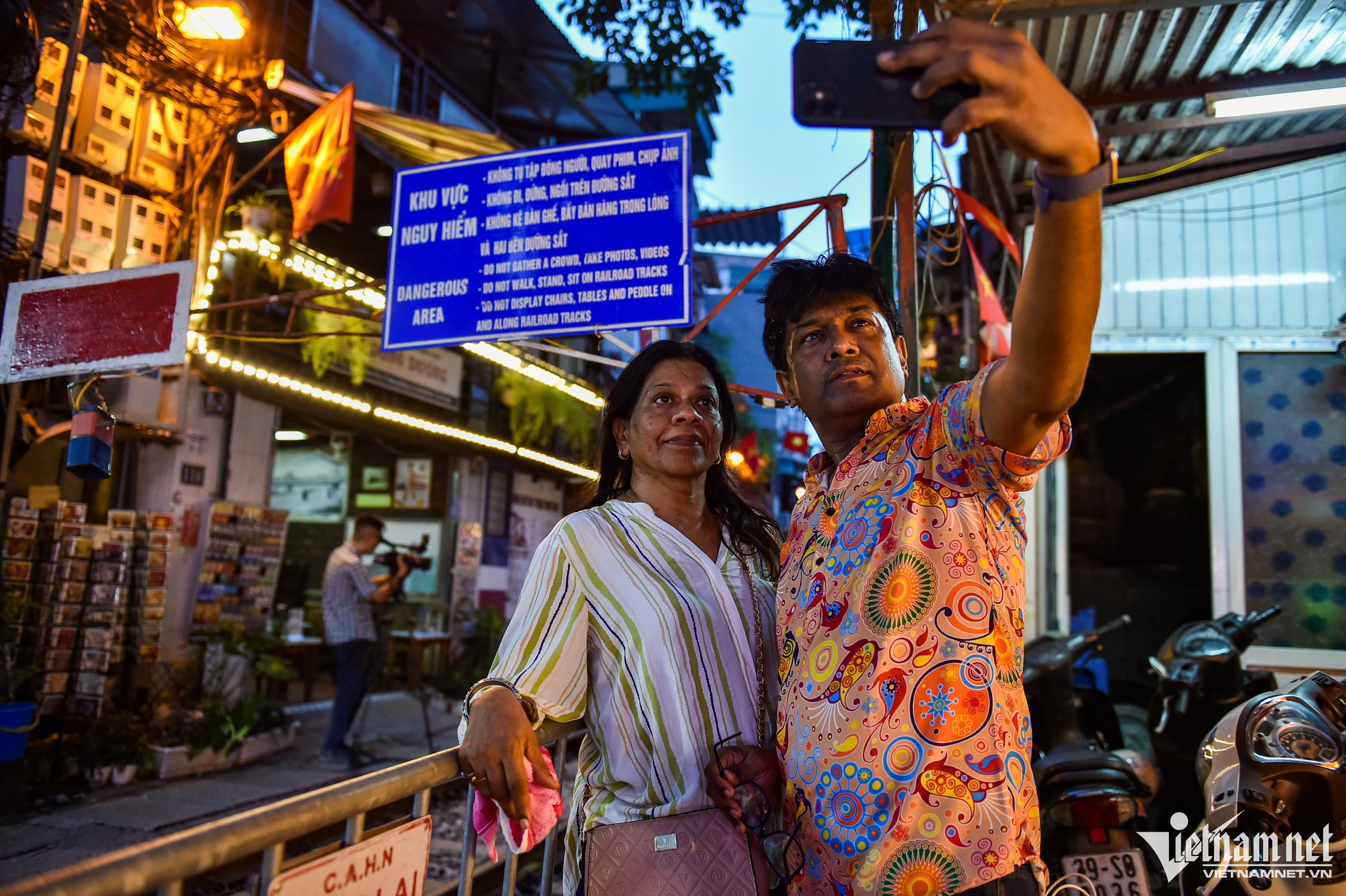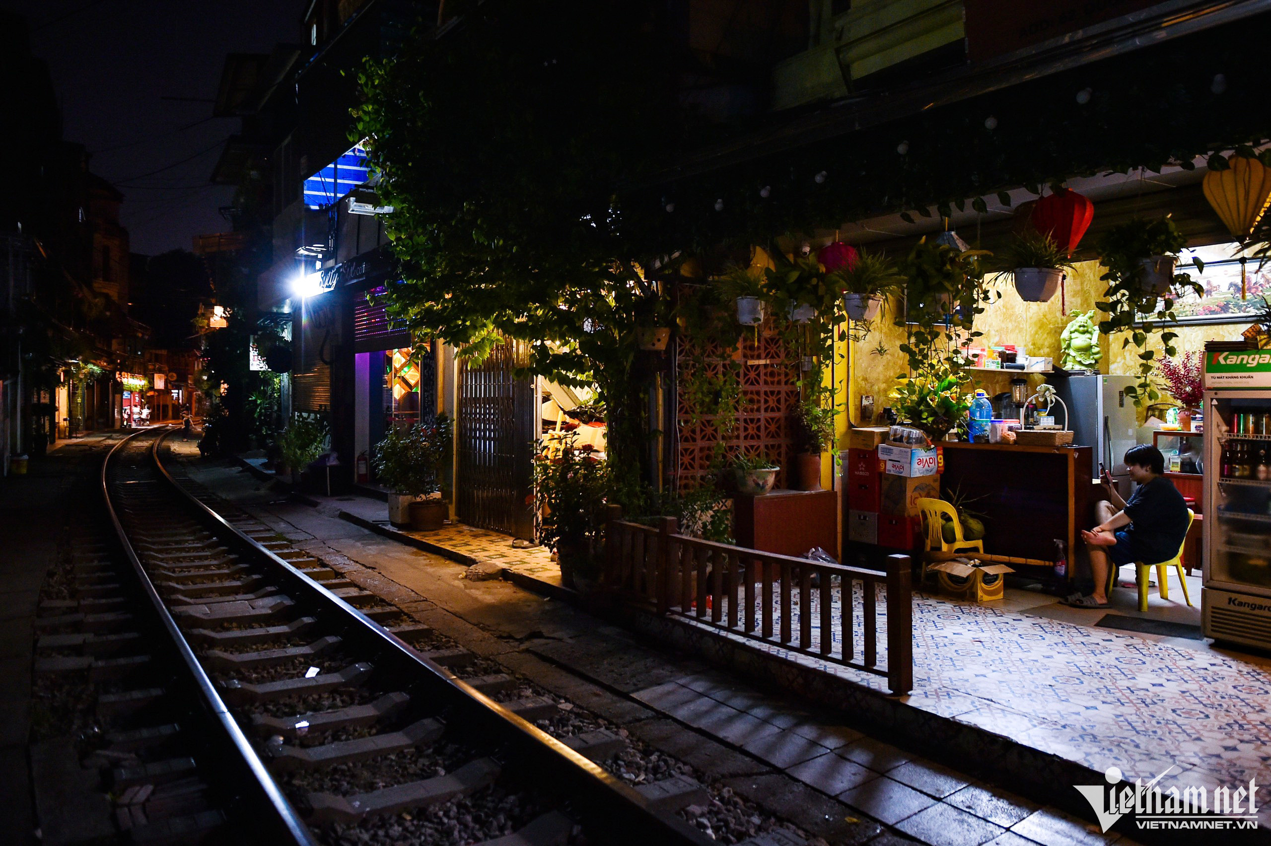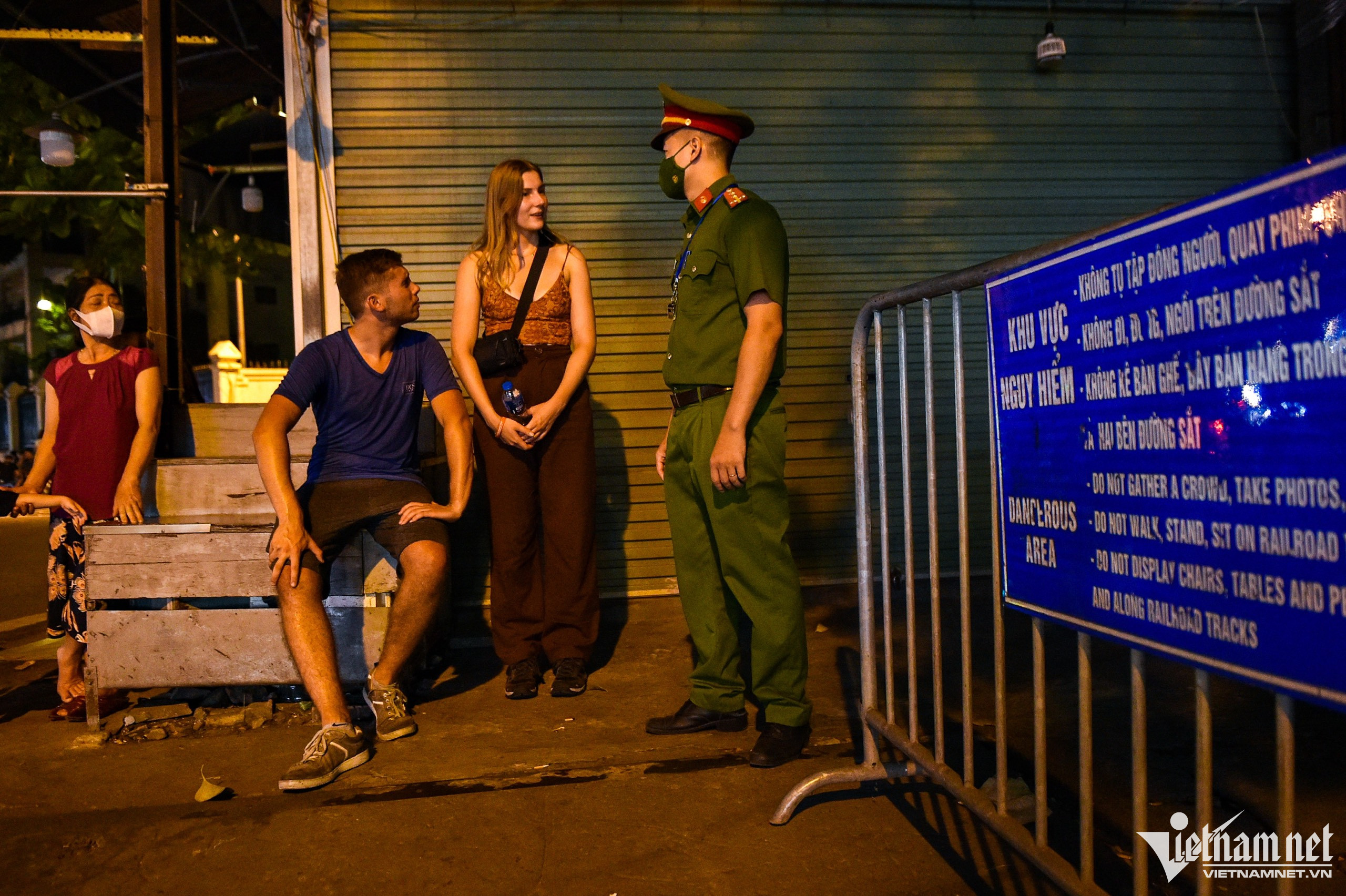 Một số hàng khóa chặt cửa, không buôn bán từ chiều tối 14/9.Một hộ kinh doanh mở hé cửa bán đồ uống mang đi. Khách của họ chủ yếu là người dân sống trong khu vực phong tỏa. "Do phải đóng cửa, nguyên vật liệu nhập về từ hôm qua tôi mang cho hàng xóm và người thân vì để lâu sẽ bị hỏng, bỏ đi thì phí", bà Quyên chia sẻ. Kinh doanh cà phê là công việc chính nhưng giờ đã bị đóng cửa, người phụ nữ ngồi bần thần trước cửa hàng của mình. Trong thời gian tới, chị và nhiều người ở phố đường tàu sẽ phải tìm công việc khác mưu sinh. 19h, không khí tại đây trầm lắng, không còn cảnh nhộn nhịp như trước đó một ngày. Một số du khách cố gắng thuyết phục để được vào trong nhưng lực lượng chức năng kiên quyết từ chối và giải thích về việc tuyến phố bị phong tỏa. Nữ du khách người Anh tỏ rõ sự tiếc nuối. Trước đó, bà được bạn bè giới thiệu phố đường tàu là địa điểm phải ghé thăm khi tới Hà Nội.Anil và vợ đến từ Ấn Độ. Ông cảm thấy rất buồn sau khi đã trải qua quãng đường dài tới Việt Nam mà không được trải nghiệm phố đường tàu. "Khi đến đây tôi được công an giải thích rằng du khách không được vào trong nữa. Tôi cảm thấy ngạc nhiên, hy vọng lần sau khi chúng tôi quay lại, nó đã được hoạt động", ông Anil nói.