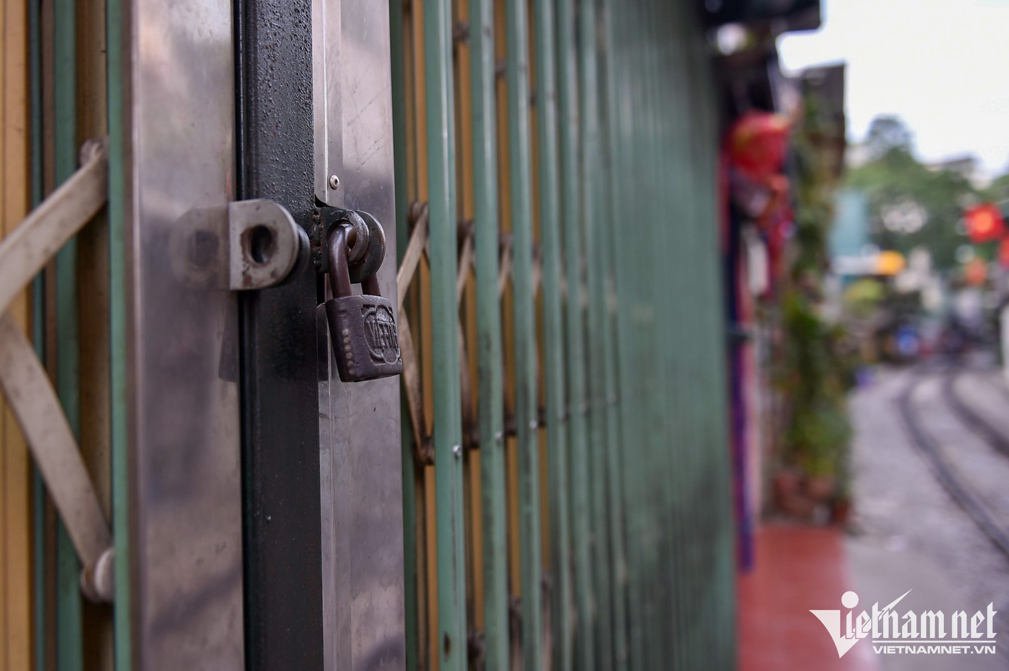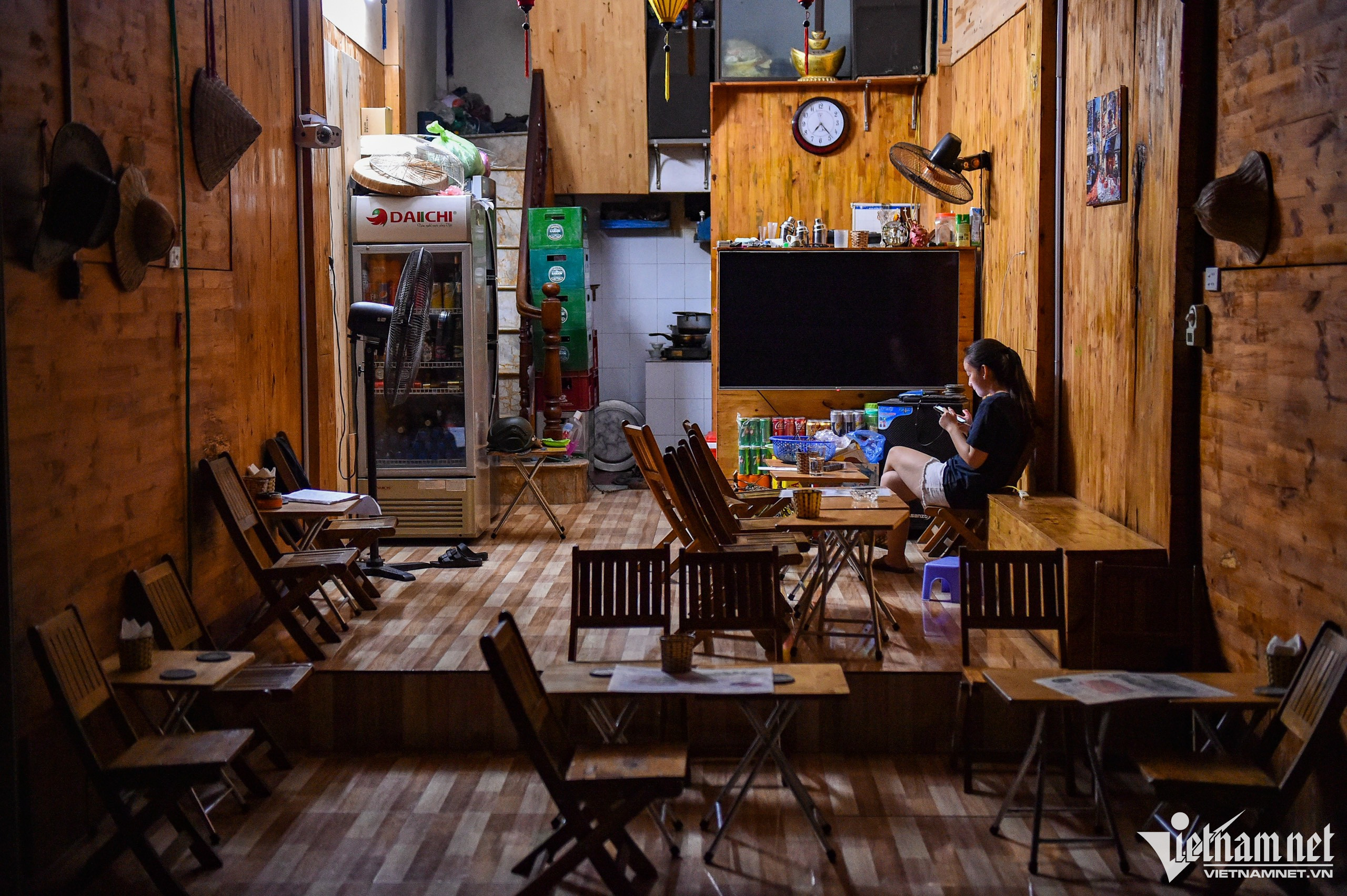 Sau khi quận Hoàn Kiếm lập hàng rào phong tỏa phố cà phê đường tàu Phùng Hưng (Hà Nội), khung cảnh nơi đây hoang vắng, các tiệm kinh doanh giải khát cửa đóng then cài, chủ và nhân viên ngồi bấm điện thoại giết thời gian.