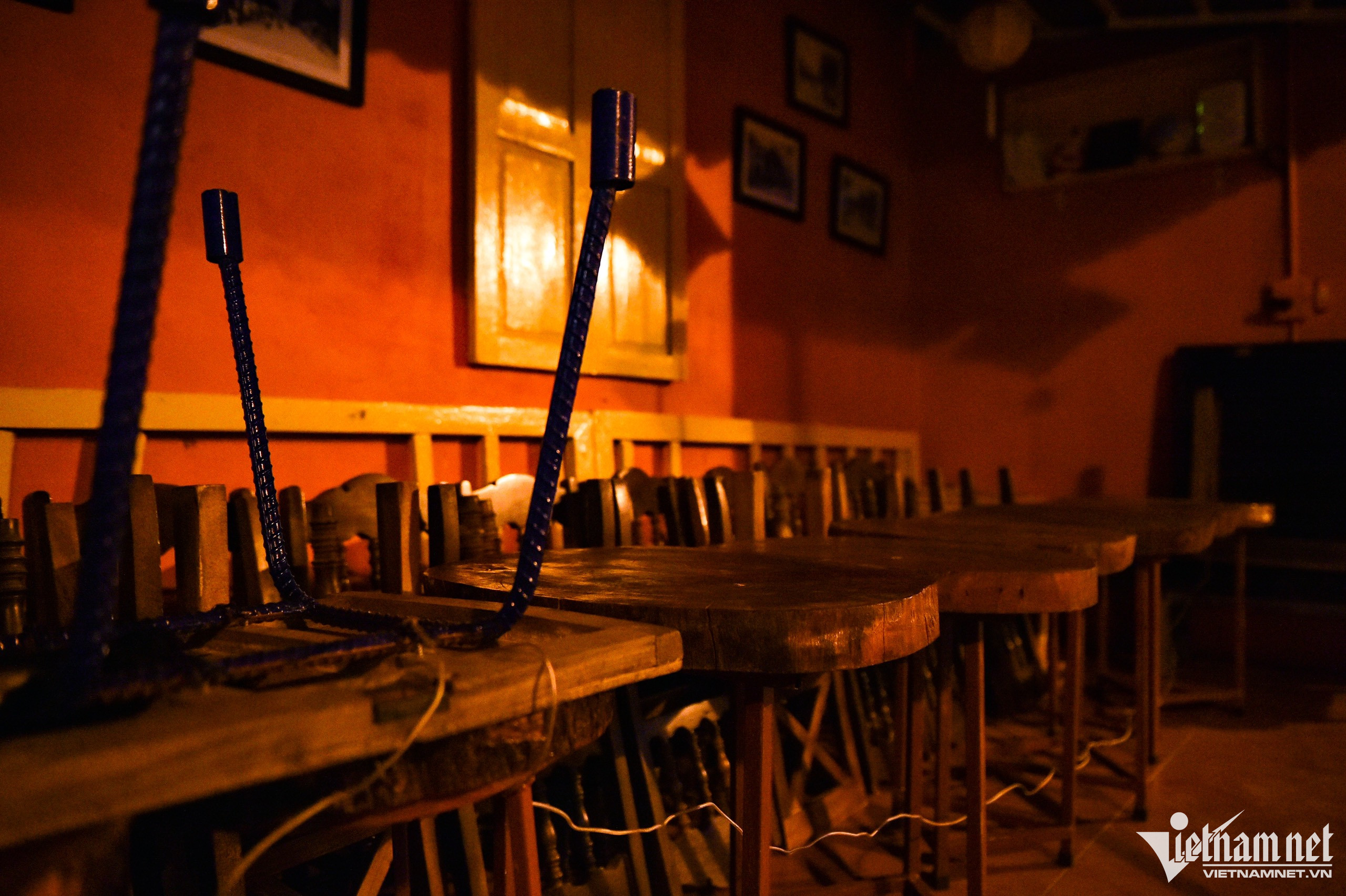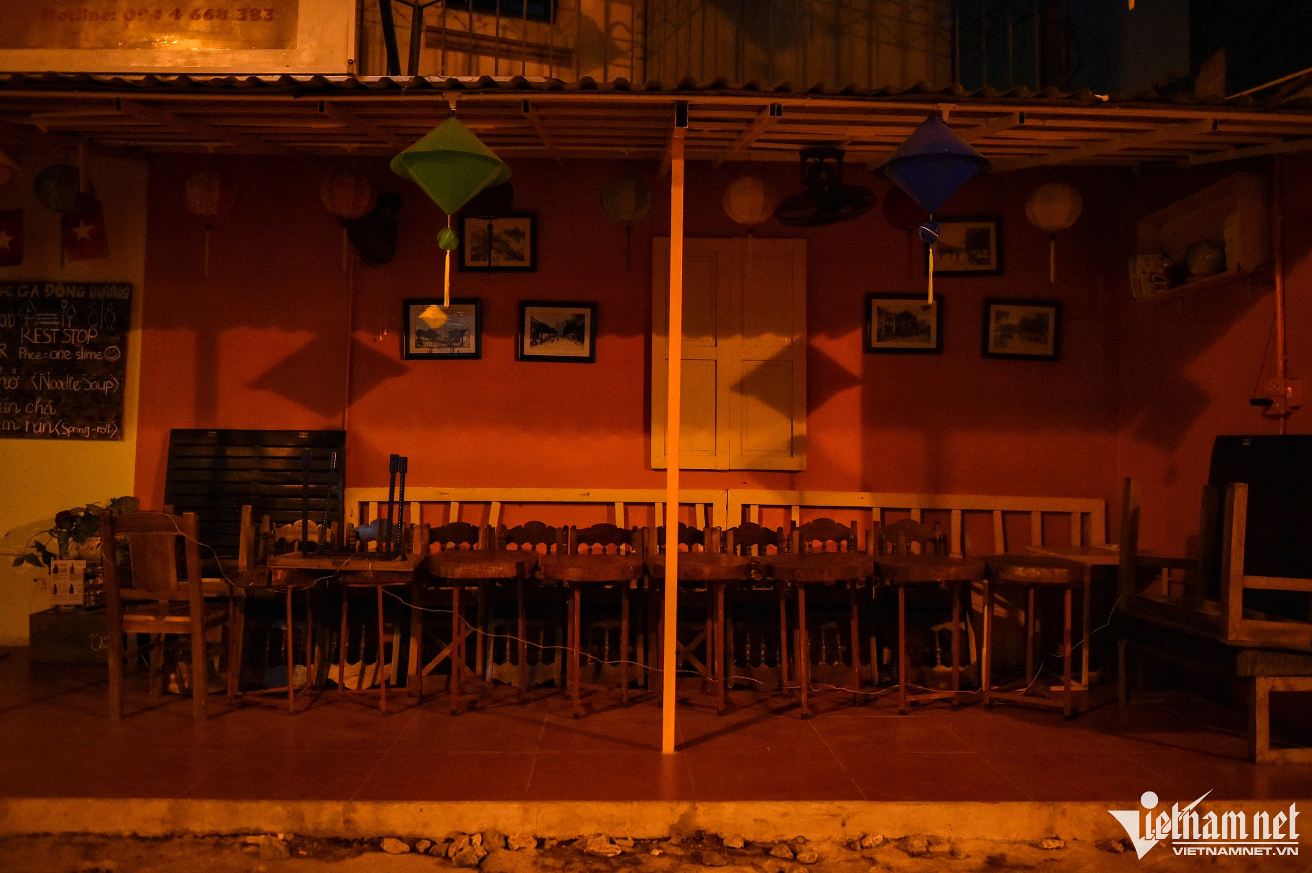 Một cửa hàng đã dọn dẹp xếp gọn bàn ghế, chăng dây từ 19h30.