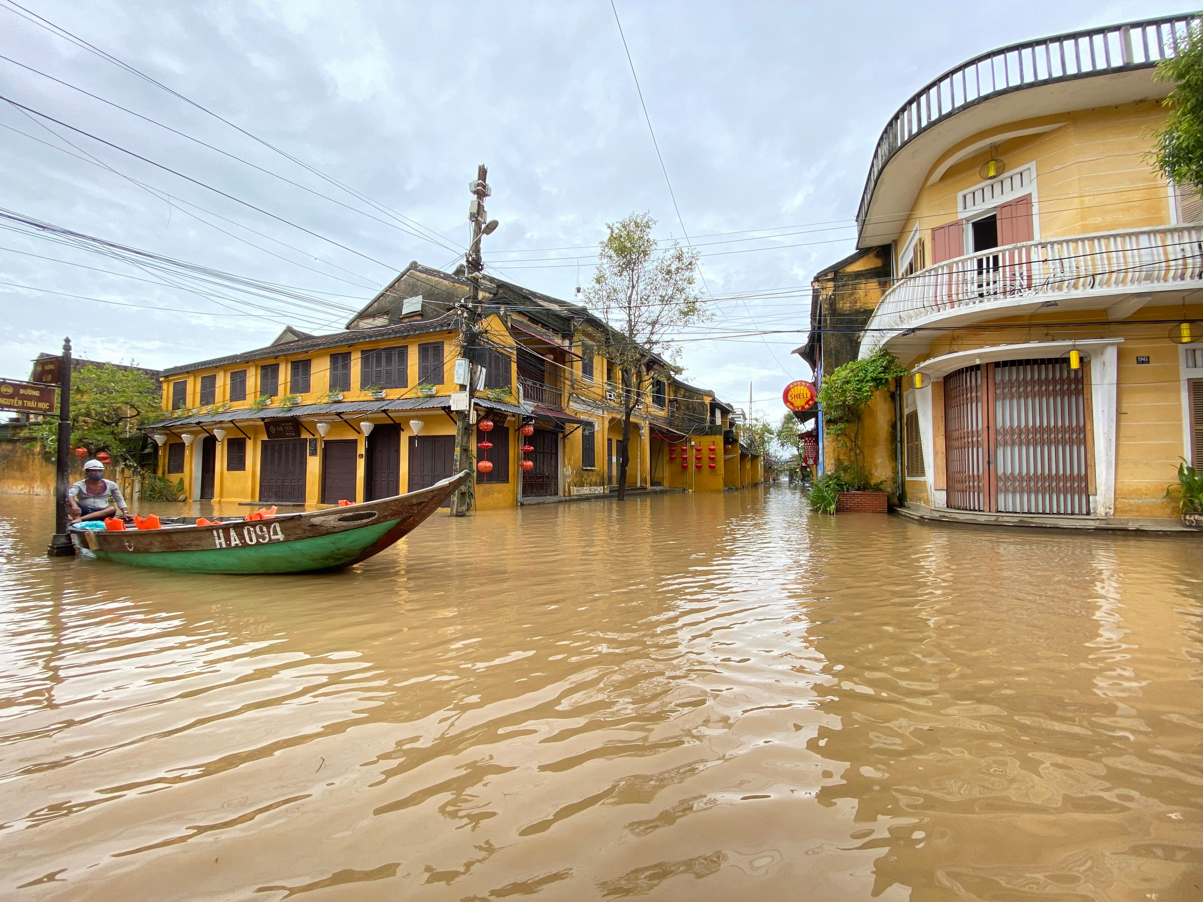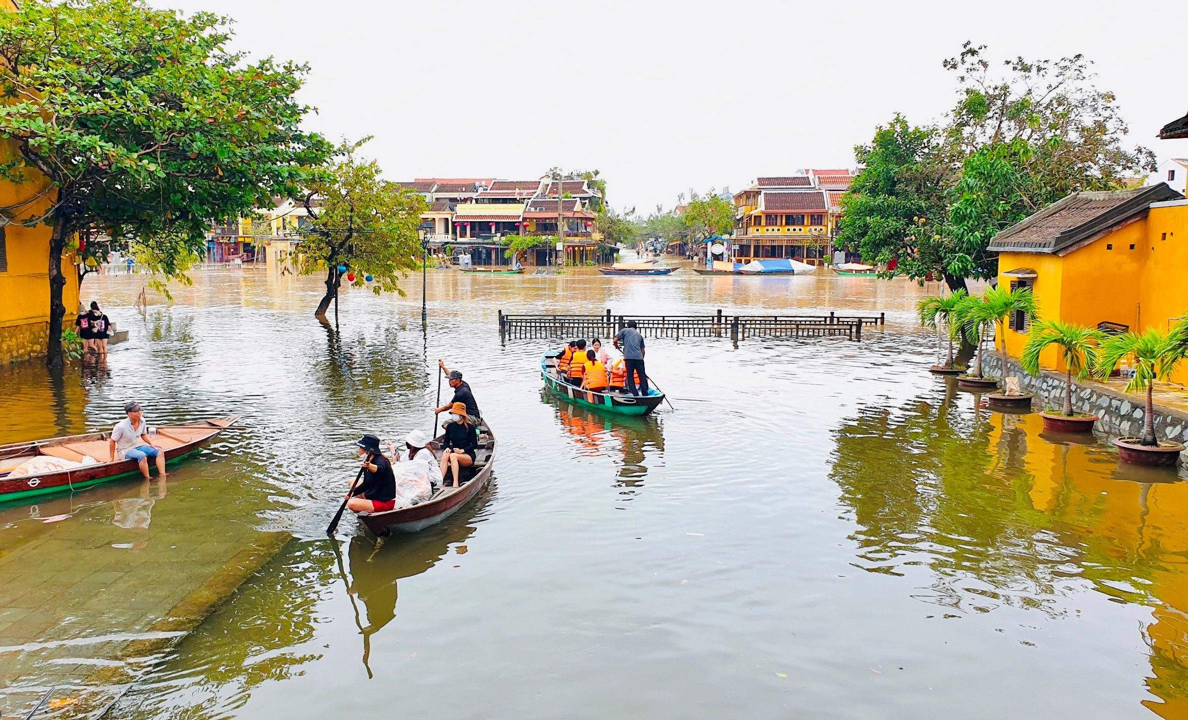 Nhiều du khách thuê ghe để tham quan Hội An mùa nước lụt.