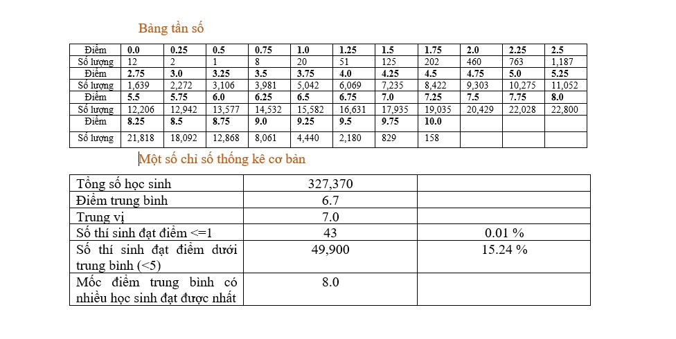 Số thí sinh có điểm <= 1 là 43 (chiếm tỷ lệ 0.01%); số thí sinh đạt điểm dưới trung bình là 49,900 (chiếm tỷ lệ 15.24%).