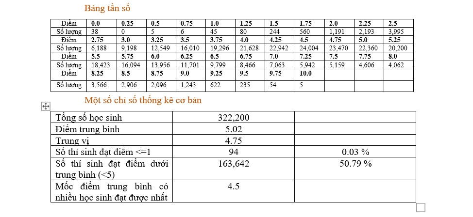 Điểm số có nhiều thí sinh đạt nhất là 4.5 điểm. Số thí sinh có điểm <= 1 là 94 (chiếm tỷ lệ 0.03%); số thí sinh đạt điểm dưới trung bình là 163,642 (chiếm tỷ lệ 50.79%).