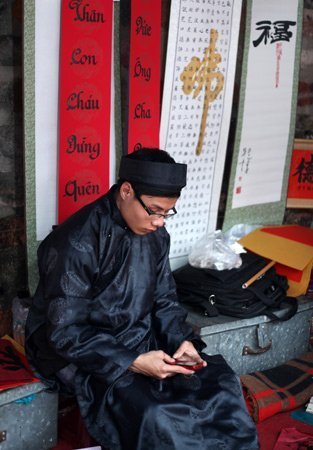 Hình ảnh những ông Đồ trong trang phục cổ, truyền thống với thiết bị công nghệ số hiên đại thời nay trở nên bình thường ở phố ông Đồ.