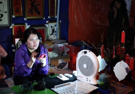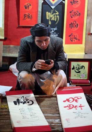 "Bà Đồ" vừa quạt chữ cho mau khô vừa có thể thoải mái trò chuyên với bạn bè, người thân qua chiếc điện thoại.