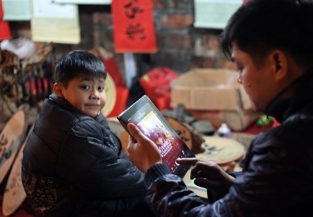 Trong khi chờ mua chữ, người đàn ông này đã kịp cập nhật ảnh có đánh chữ "Phố Văn Miếu" lên FaceBook thông báo cho bạn bè, người thân thông qua chiếc máy tính bảng.