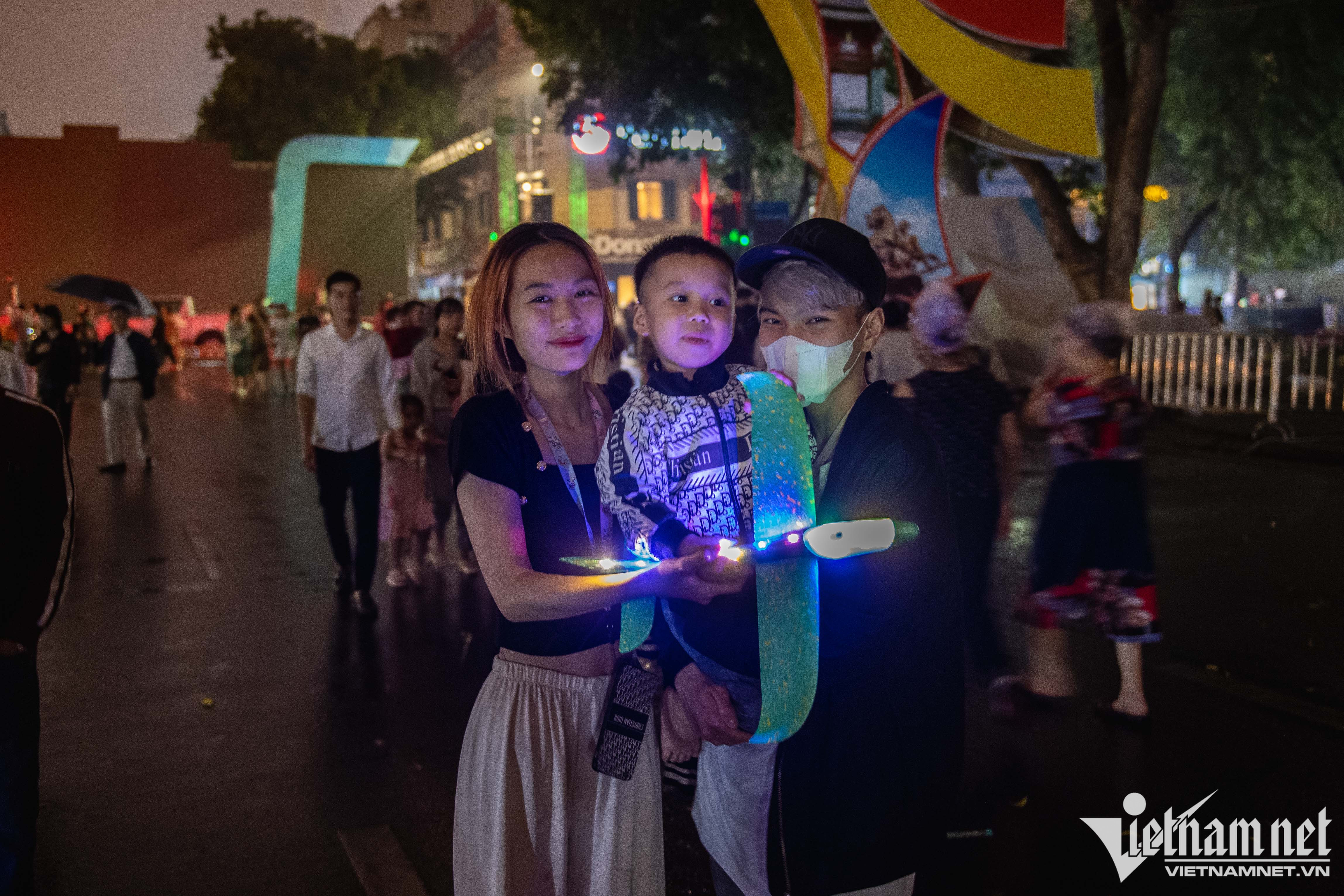 Không khí vui chơi vẫn diễn ra khắp phố đi bộ bên hồ Gươm. Nhiều nhóm bạn trẻ, gia đình sử dụng đồ chơi phát sáng để đi lại.