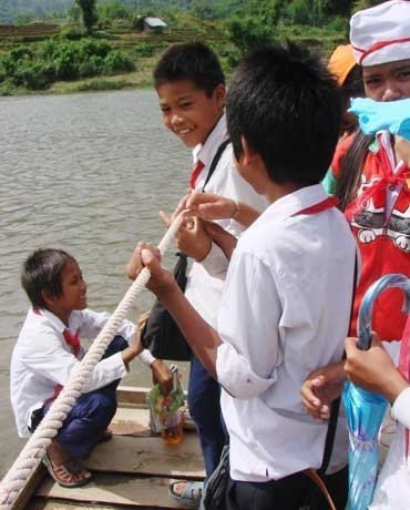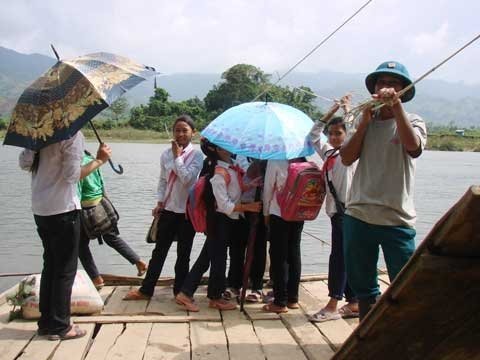 | Hàng ngày hàng trăm học sinh xã Sơn Ba đi học trên bè tự tạo và đu dây qua sông |