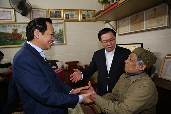 Phó Thủ tướng Vương Đình Huệ thăm hỏi thương binh Đào Đức Toàn. Ảnh: VGP/Thành Chung |