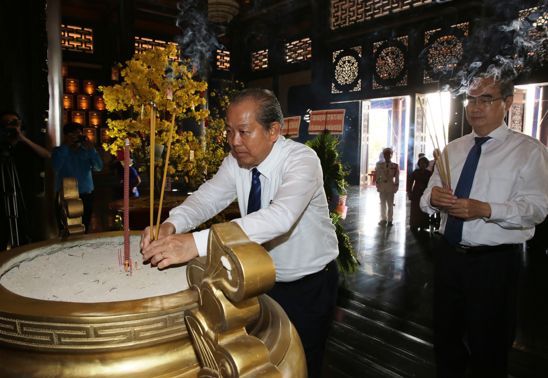 Phó Thủ tướng Thường trực Chính phủ Trương Hòa Bình; Bí thư Thành ủy TPHCM Nguyễn Thiện Nhân dâng hương tưởng niệm các anh hùng liệt sĩ, đồng chí, đồng bào đã hy sinh vì đất nước tại Đền Gia Định. Ảnh: VGP |