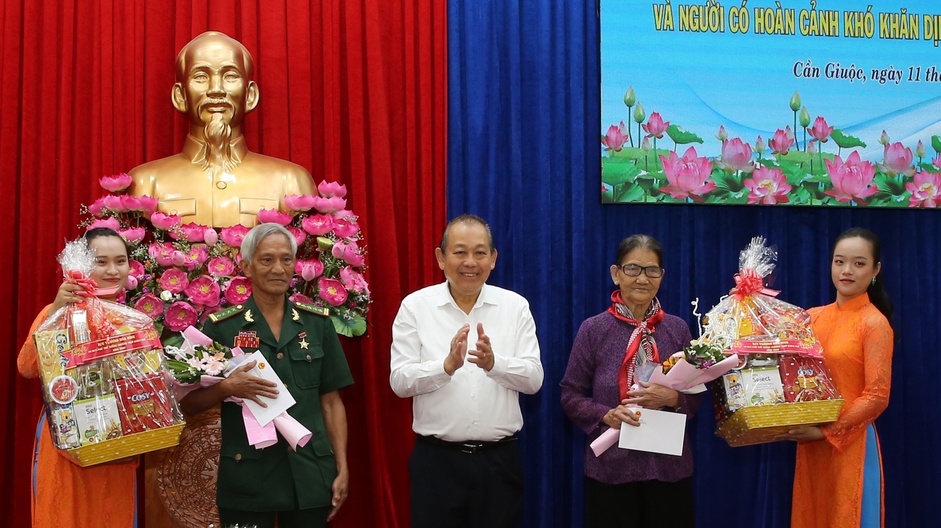 Phó Thủ tướng cùng lãnh đạo tỉnh và đại diện các tổ chức, cá nhân tham gia đóng góp kinh phí trao tặng gần 1.000 phần quà, với tổng số tiền 850 triệu đồng cho các Mẹ Việt Nam Anh hùng, Anh hùng Lực lượng vũ trang, gia đình chính sách, lực lượng nòng cốt và gia đình khó khăn trên địa bàn huyên Cần Giuộc, tỉnh Long An.