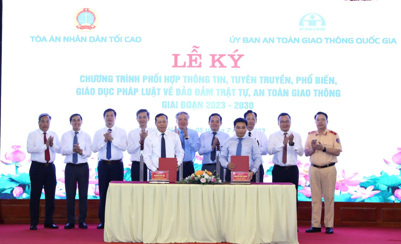 Chiều 5/7, tại Hà Nội, TAND Tối cao và Ủy ban An toàn giao thông Quốc gia tổ chức “Lễ ký kết Chương trình phối hợp thông tin, tuyên truyền, phổ biến, giáo dục pháp luật về trật tự an toàn giao thông giai đoạn 2023 - 2030”.
