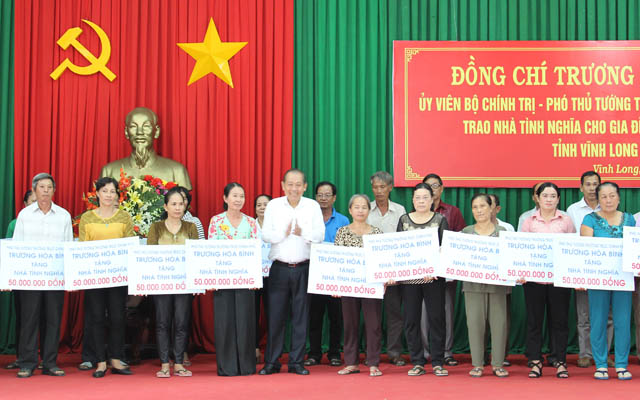 Phát biểu tại buổi lễ trao nhà tình nghĩa, Phó Thủ tướng Trương Hòa Bình đánh giá cao sự quan tâm của Đảng bộ, chính quyền và nhân dân Vĩnh Long trong công tác đền ơn đáp nghĩa cũng như có nhiều hoạt động thiết thực để tưởng nhớ, tri ân những người đã hy sinh xương máu, tuổi thanh xuân cho Tổ quốc. Đặc biệt, trong sáu năm qua, tỉnh Vĩnh Long đã rất nỗ lực để hỗ trợ xây dựng, sửa chữa hơn 6.600 căn nhà cho gia đình chính sách; qua đó, góp phần giúp cho người có công ổn định cuộc sống, yên tâm phấn đấu vươn lên, tiếp tục có nhiều đóng góp vào sự nghiệp đổi mới, xây dựng và phát triển đất nước.