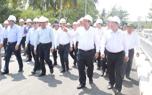 Phó Thủ tướng Thường trực Trương Hòa Bình kiểm tra công tác hạn mặn tại cống Vũng Liêm